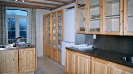 Gelijkvloers: Inkom met berging voor schoenen en jassen, woonkamer met openhaard, ruime zitgelegenheid voorzien van TV, video, DVD, hifi + CD. Eetkamer,drie grote ronde tafels en 2 Kinderstoelen, tuindeuren naar (dak / zonne) terras. Een professionele keuken met groot electrischfornuis, keukentrolley, vaatwasser, koffiezetapparaat, oven, microgolf (magnetron), koel- en vrieskast en waterkoker. 2 x wc.